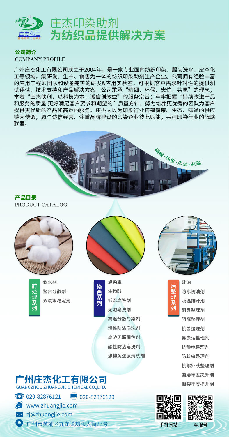 廣州莊杰化工有限公司專注于高溫勻染劑的研發(fā)與銷售,擁有豐富的應(yīng)用經(jīng)驗(yàn),旗下所主營(yíng)的產(chǎn)品有活性防沾皂洗劑,曲磨牢度提升劑,三抗整理劑等,且長(zhǎng)期提供技術(shù)支持和小樣打板,歡迎來電索樣:400-888-6775。